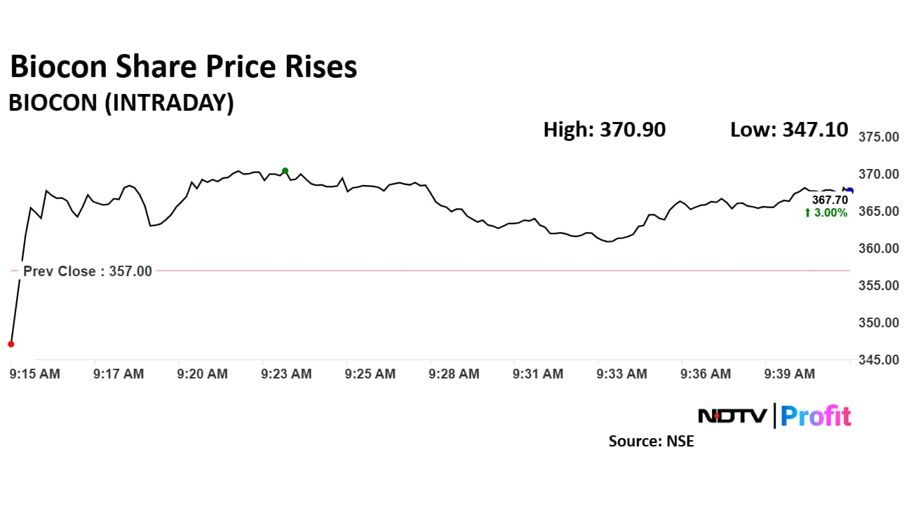 Biocon share price rose 3.89% to Rs 370.90 apiece. It was trading 1.90% higher at Rs 363.80 apiece as of 9:45 a.m. as compared to 0.48% advance in the NSE Nifty 50 index.