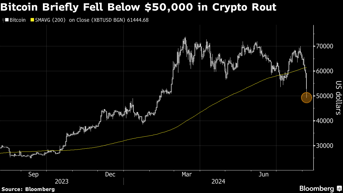 Top token Bitcoin traded 9% lower at $53,883 as of 4:51 p.m. in New York, adding to a 13.1% drop last week that was the worst since the period when the FTX exchange imploded. Ether shed over a fifth of its value before paring some of the slide to change hands at $2,419. Most major coins nursed losses.