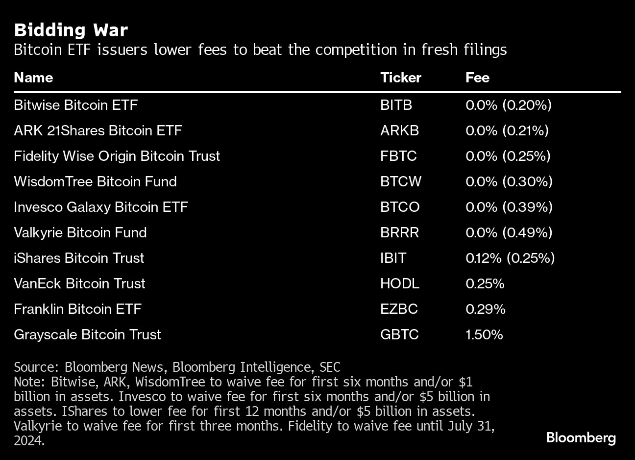 While fee wars are a common feature of the $8 trillion ETF arena, the battle to lower costs broke out before the spot Bitcoin ETFs launched. BlackRock, Ark Investment Management and Invesco were among the issuers who dropped their costs in the days leading up to Wednesday's approval.