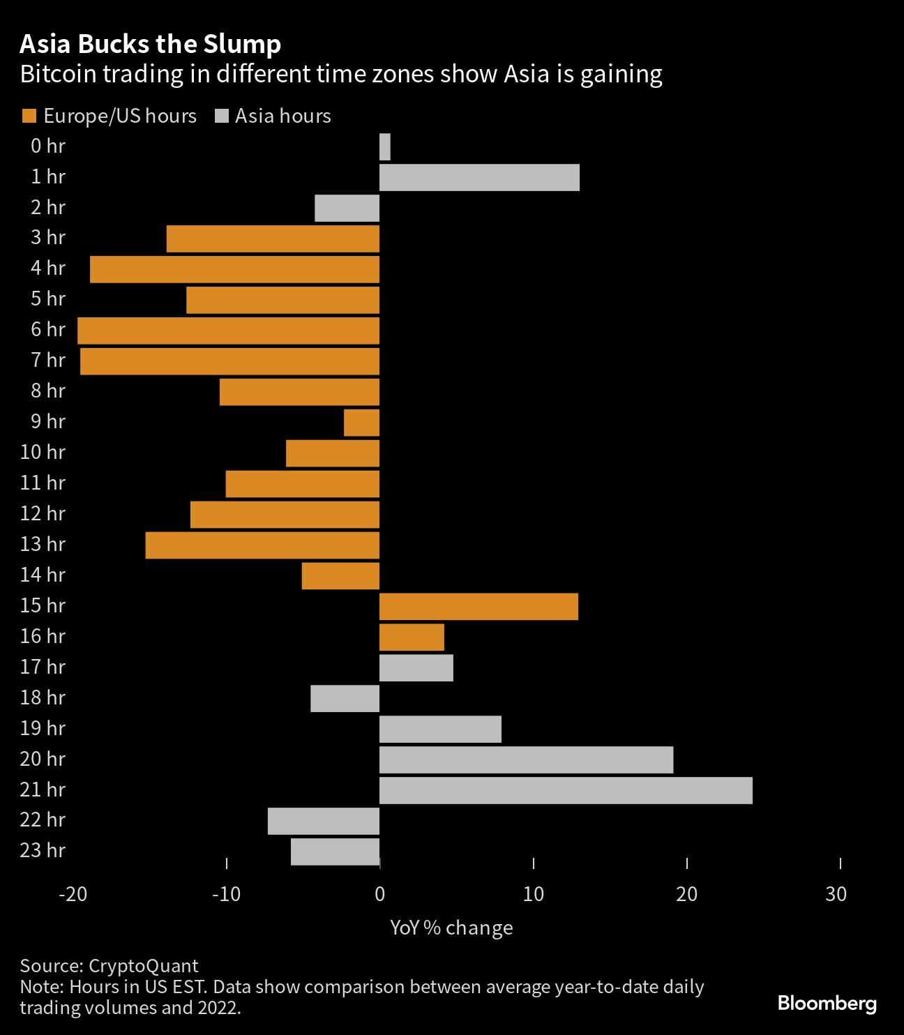 Investors and marketplaces are flocking to Singapore, Japan and South Korea — and more recently to Hong Kong, which this month introduced a new regulatory regime for crypto. Bitcoin trading activity in predominantly Asian hours have risen this year even as they slumped in US and European hours, data compiled by CryptoQuant show. The token accounts for almost half of crypto's total market value.