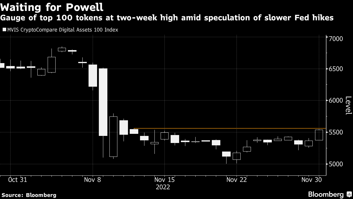 Powell is due to speak later Wednesday at an event hosted by the Brookings Institution and may echo fellow Fed officials in signaling a half-point rate rise at their final meeting of the year after four successive 75 basis-point moves. Rapidly tightening monetary policy has been the key trigger of a 63% slump in a gauge of top digital assets this year.