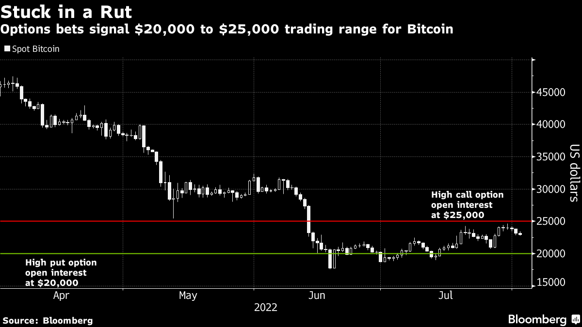 Bets in the options markets suggest speculators see $25,000 as a ceiling for Bitcoin and $20,000 as a floor. This is because of a high number of outstanding call and put contracts -- so-called open interest -- at those strike prices respectively, according to data compiled by Coinglass.
