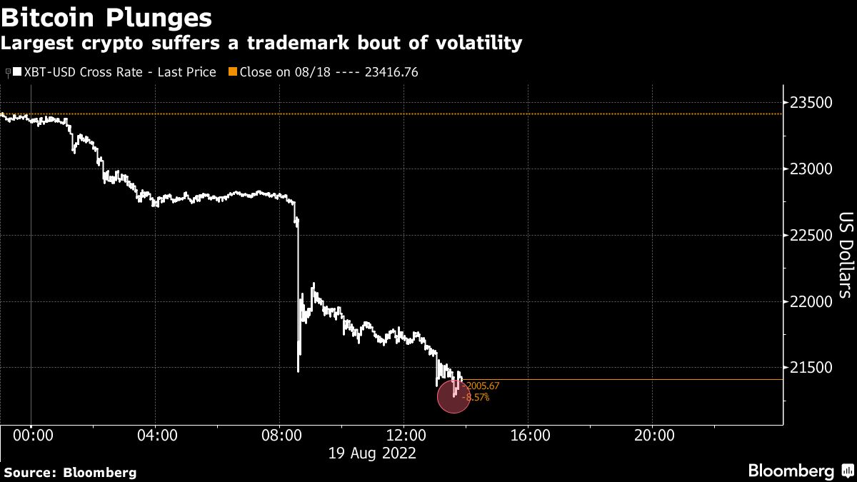 Bitcoin, the largest virtual coin by market capitalization, tumbled as much as 9.2% to $21,271, the biggest intraday drop since June 18. Ether and smaller tokens saw even sharper declines, with Avalanche, Cardano and Solana falling more than 10%.