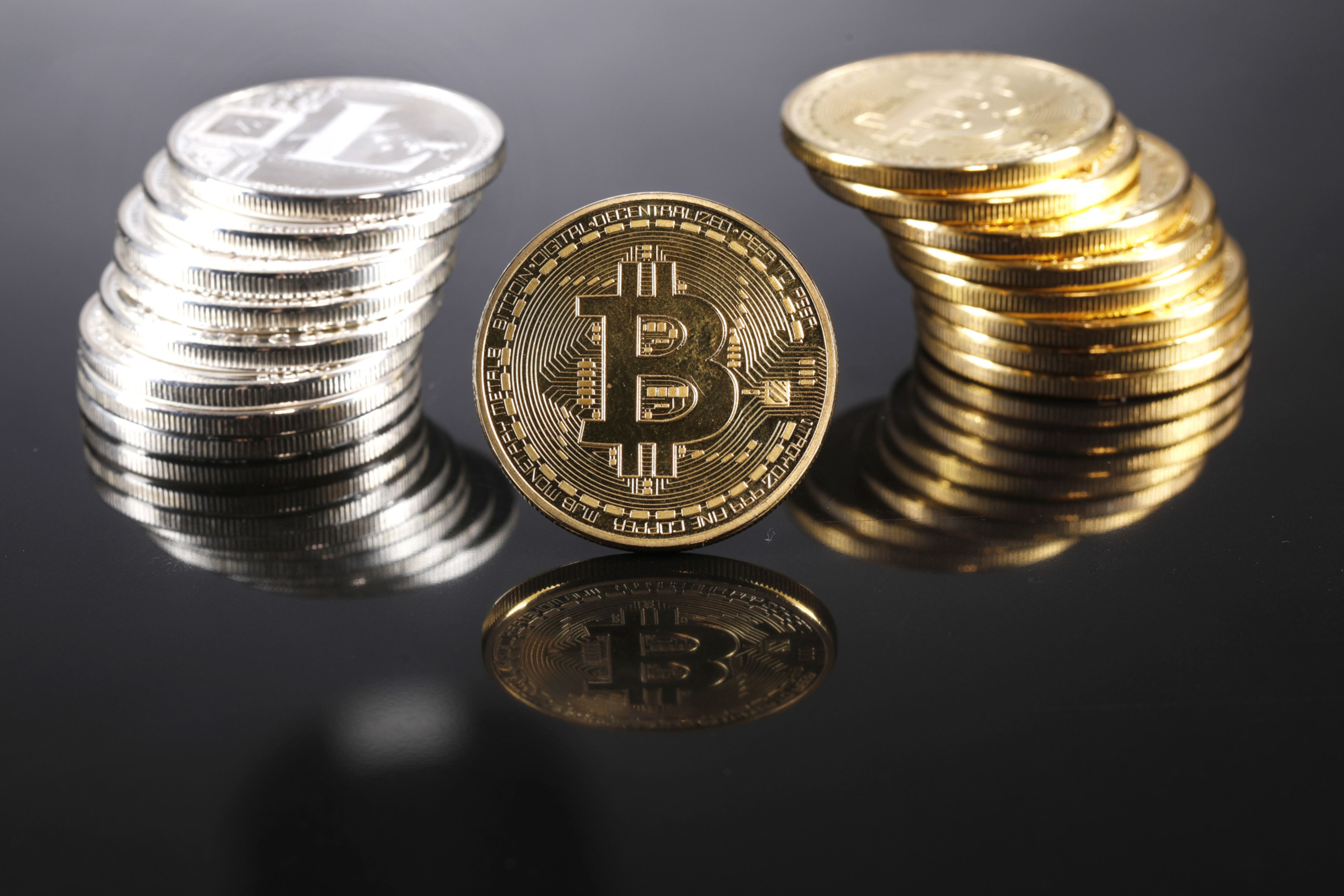 Coins representing Bitcoin, center and right, Litecoin, left, cryptocurrencies sit reflected on a polished surface in the U.K. (Photographer: Luke MacGregor/Bloomberg)