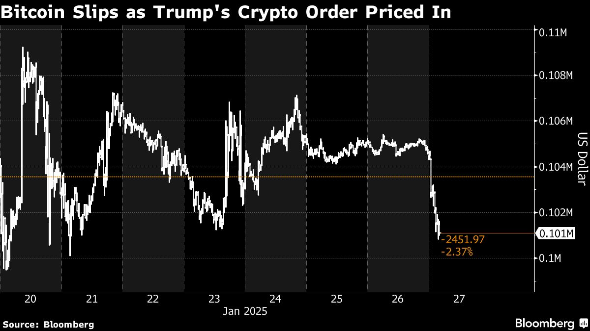 The original cryptocurrency slid as much as 3.70% to below $101,000 on Monday while smaller tokens like Solana and Cardano, which have rallied since Trump's election victory, fell than more 5%, according to data compiled by Bloomberg.
