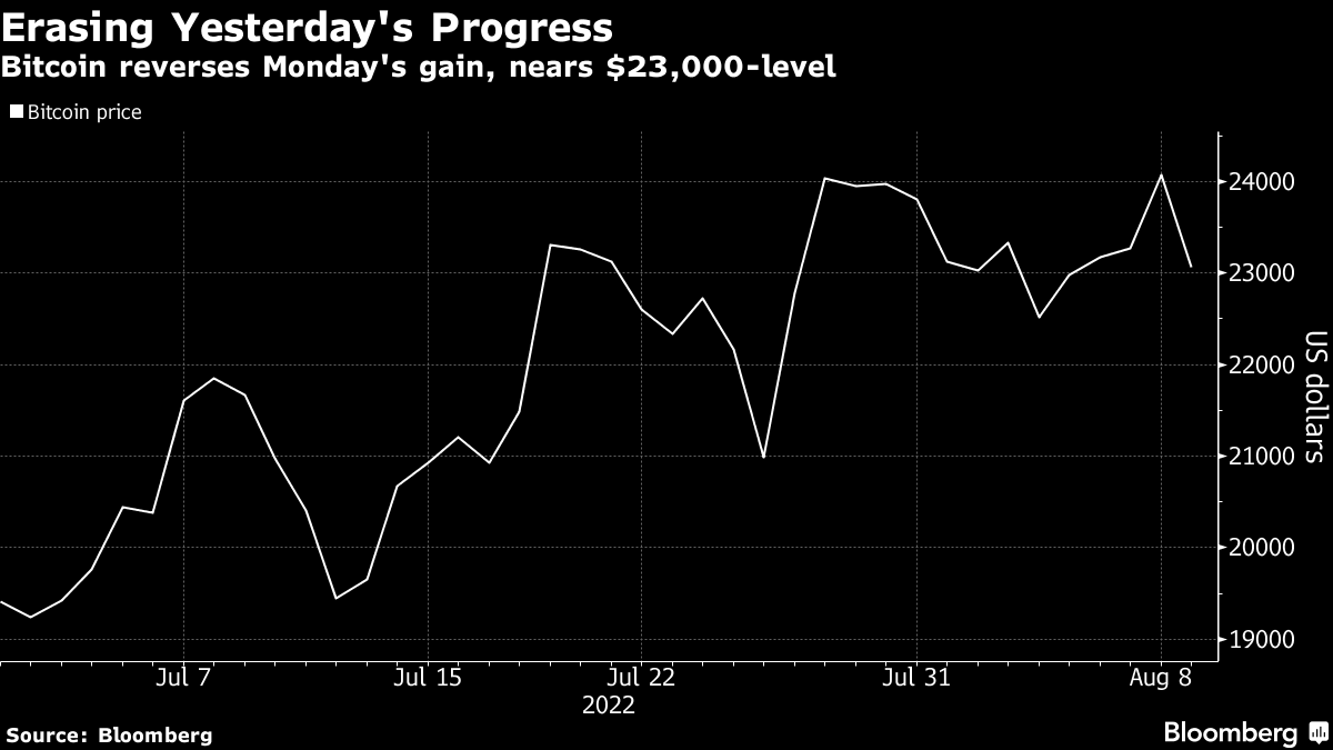Despite Tuesday's drop, Bitcoin has enjoyed a recent uptick after months of being beaten down, as it finally broke through several closely watched price levels. The bellwether crypto asset has been trading around $23,000 after posting its best month since October in July.