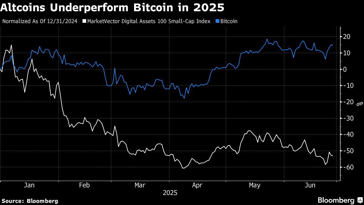 In sharp contrast, altcoins — the catch-all term for all digital assets outside of Bitcoin and stablecoins — are faltering. A MarketVector index tracking the bottom half of the largest 100 digital assets, which more than doubled in the aftermath of Donald Trump's Nov. 5 election victory, has since given up all those gains and is down around 50% in 2025.