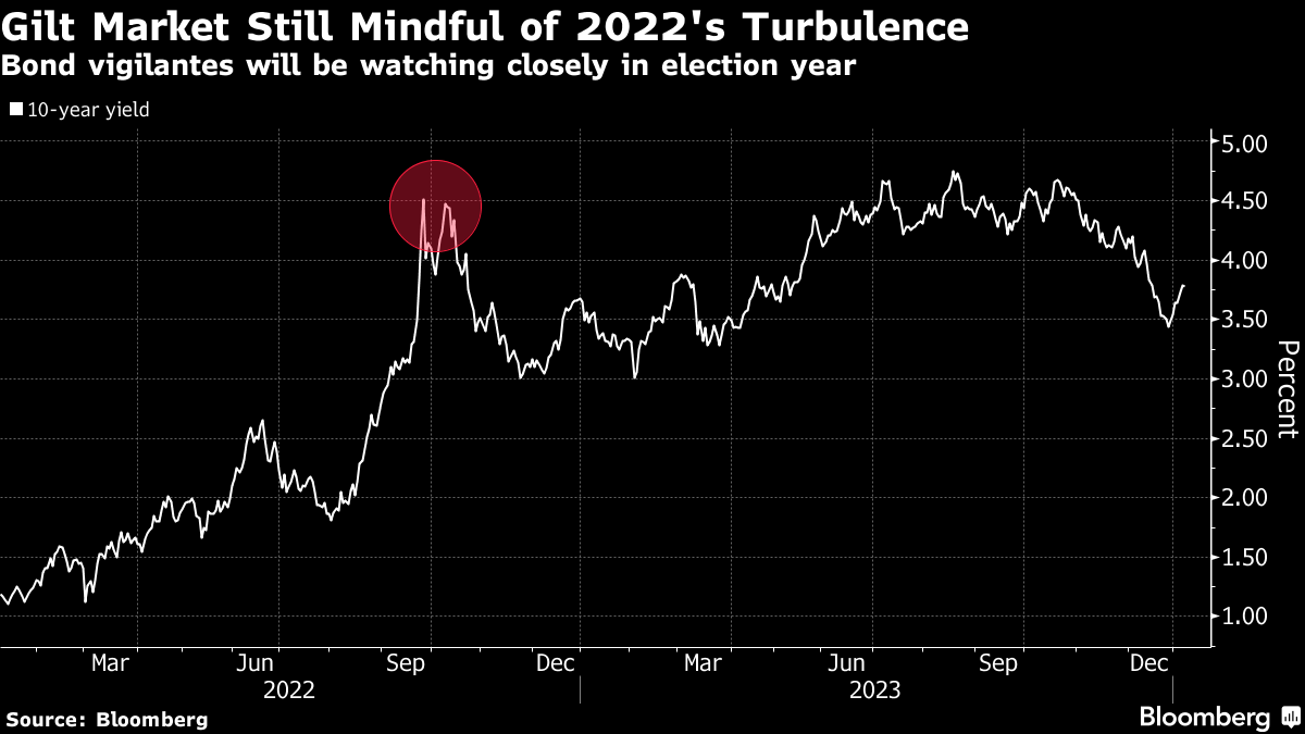 “As inflation falls in the UK and we get closer to the general election date, major UK political parties may be more tempted to promise looser fiscal policy — the more this occurs, the greater the likelihood of the return of the bond vigilantes,” wrote Paul in response to questions from Bloomberg News. “In the lead-up to this year's UK election, we're watching the fiscal policy stance.”