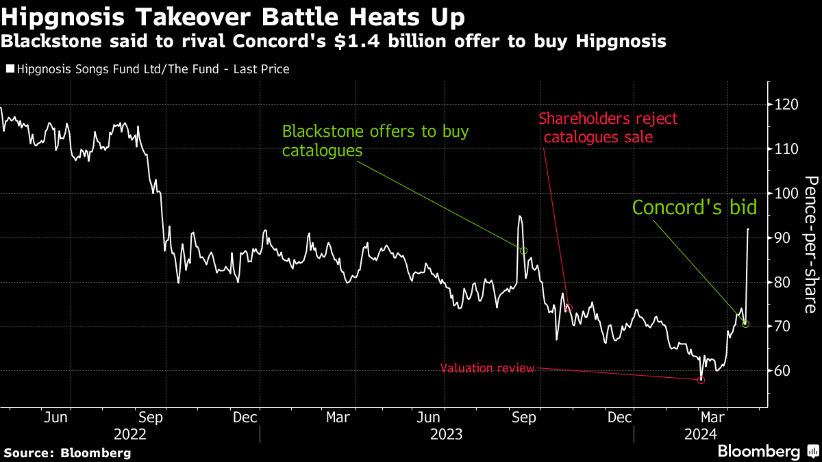 Shares of Hipgnosis have surged about 30% since the Concord offer and closed at 91.9 pence on Friday, slightly below its offer price.