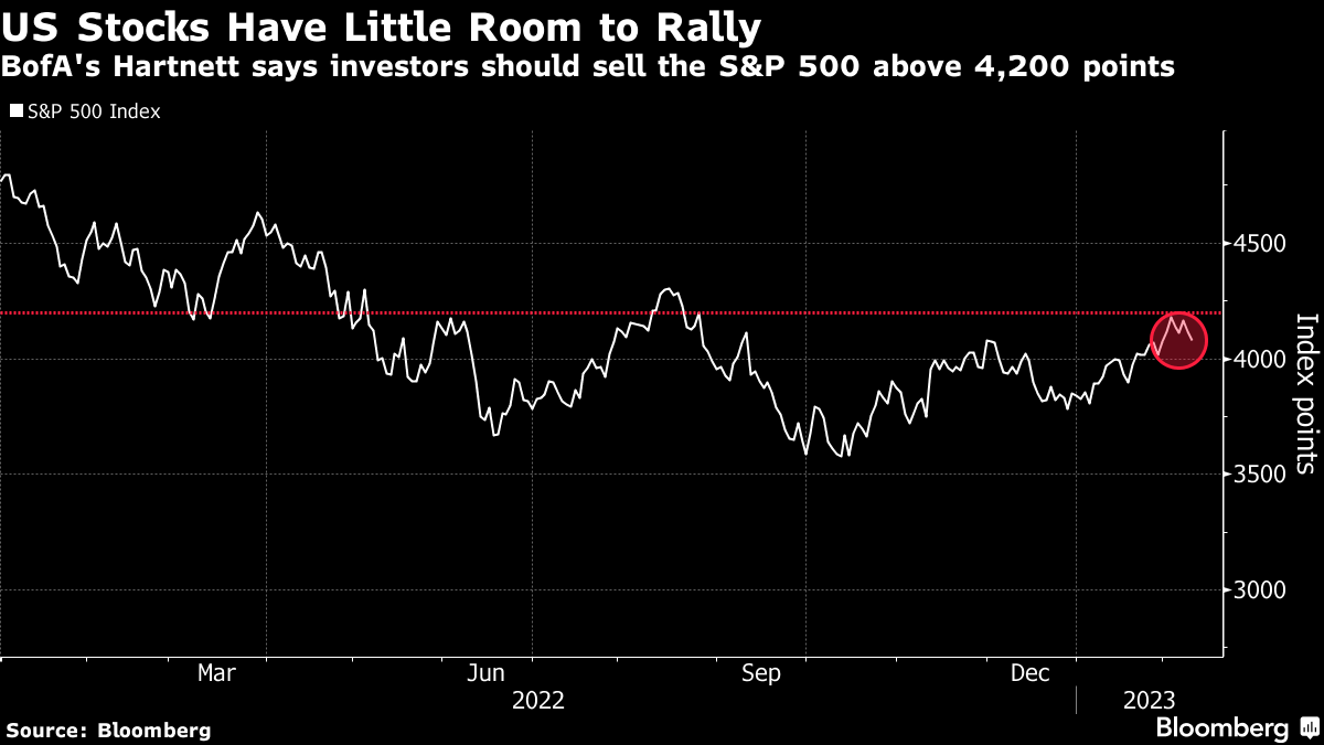 In the meantime, Hartnett — who was broadly negative on stocks last year, while the S&P 500 sank into a bear market — reiterated his recommendation that investors sell the S&P 500 above 4,200 points — about 3% higher than current levels.