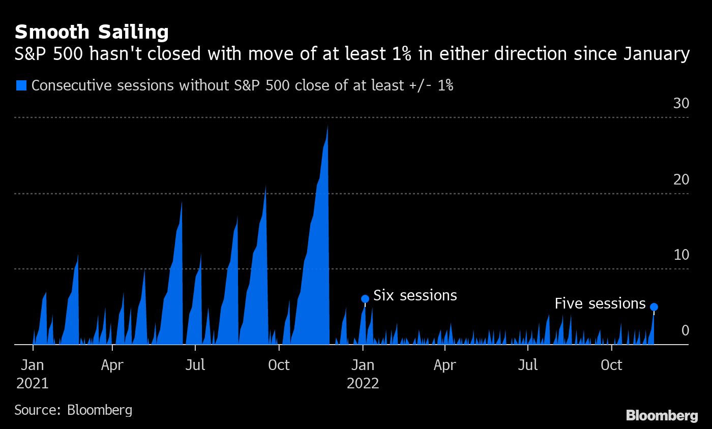 Market volatility has calmed after wild swings earlier this year. The S&P 500 Index has now gone five consecutive sessions without closing either 1% higher or lower for the first time since January, and traders expect swings to ease even further in the coming weeks.
