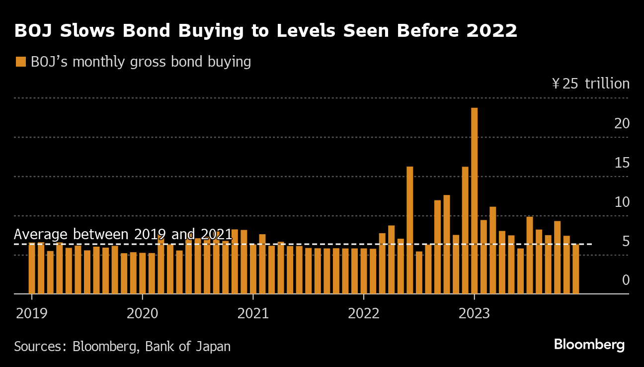 “The decision to leave the purchase amount of 10-25 year bonds today indicates a quite aggressive reduction for the month,” said Keisuke Tsuruta, senior fixed-income strategist at Mitsubishi UFJ Morgan Stanley Securities Co. “The central bank probably wants to cut the buying whenever it can.”