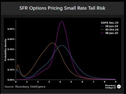 “Options on SOFR futures are pricing for the Fed to cut once more and be done for the year, according to our risk-neutral distribution model,” said Ira Jersey and Will Hoffman at Bloomberg Intelligence.