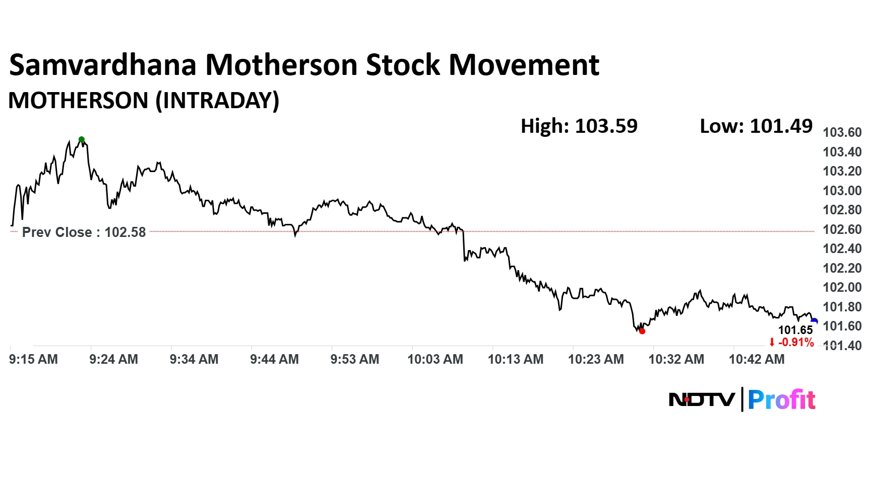 Shares of Samvardhana Motherson were down 0.9% at Rs 101.65 as of 11:00 a.m.