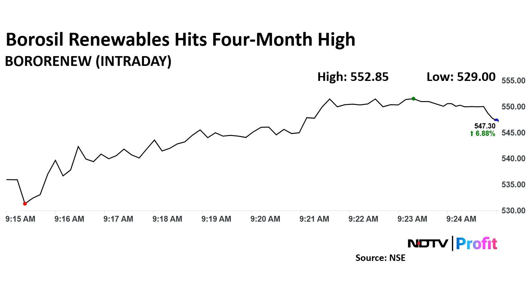 Share price of Borosil Renewables rose as much as 7.97% to Rs 552.85 apiece, the highest level since Aug. 2. It pared gains to trade 5.2% higher at Rs 538.65 apiece, as of 9:46 a.m. This compares to a flat NSE Nifty 50.