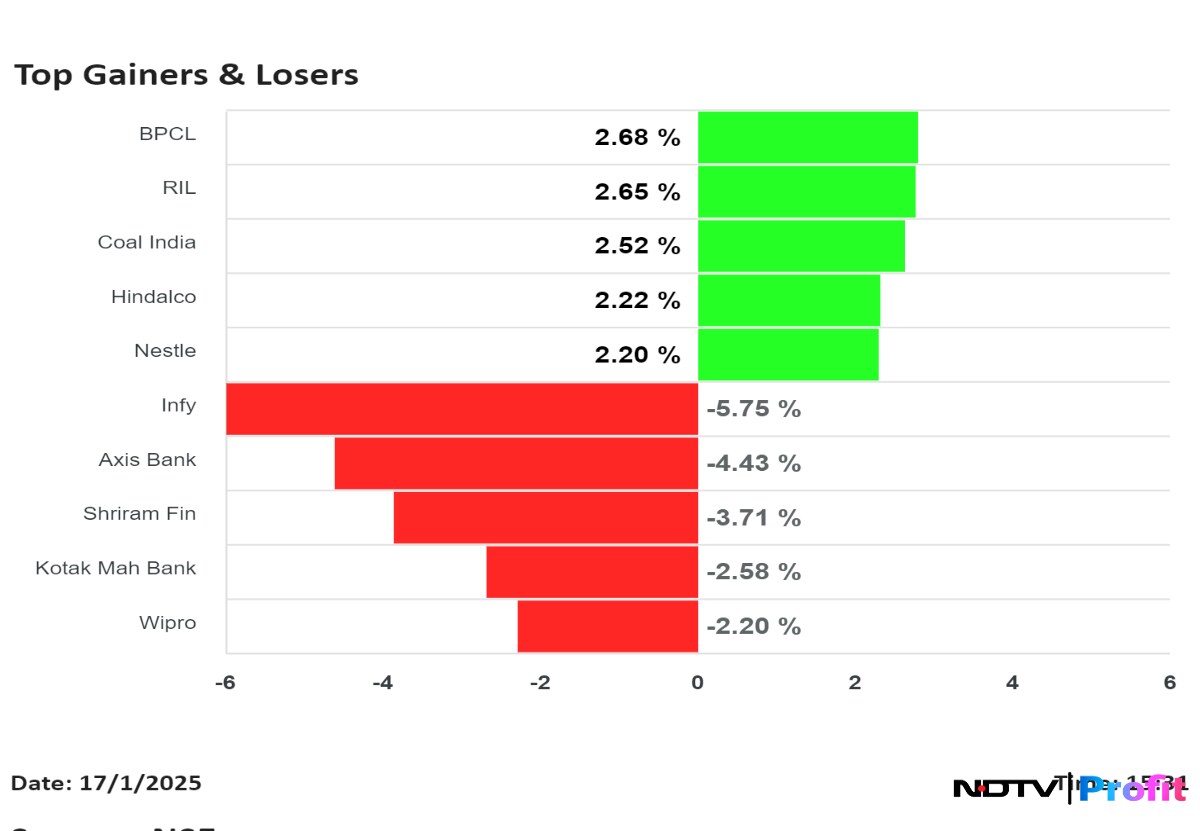 Among the losers were shares of Infosys Ltd., Axis Bank Ltd., Shriram Finance Ltd., Kotak Mahindra Bank Ltd., and Mahindra & Mahindra Ltd.