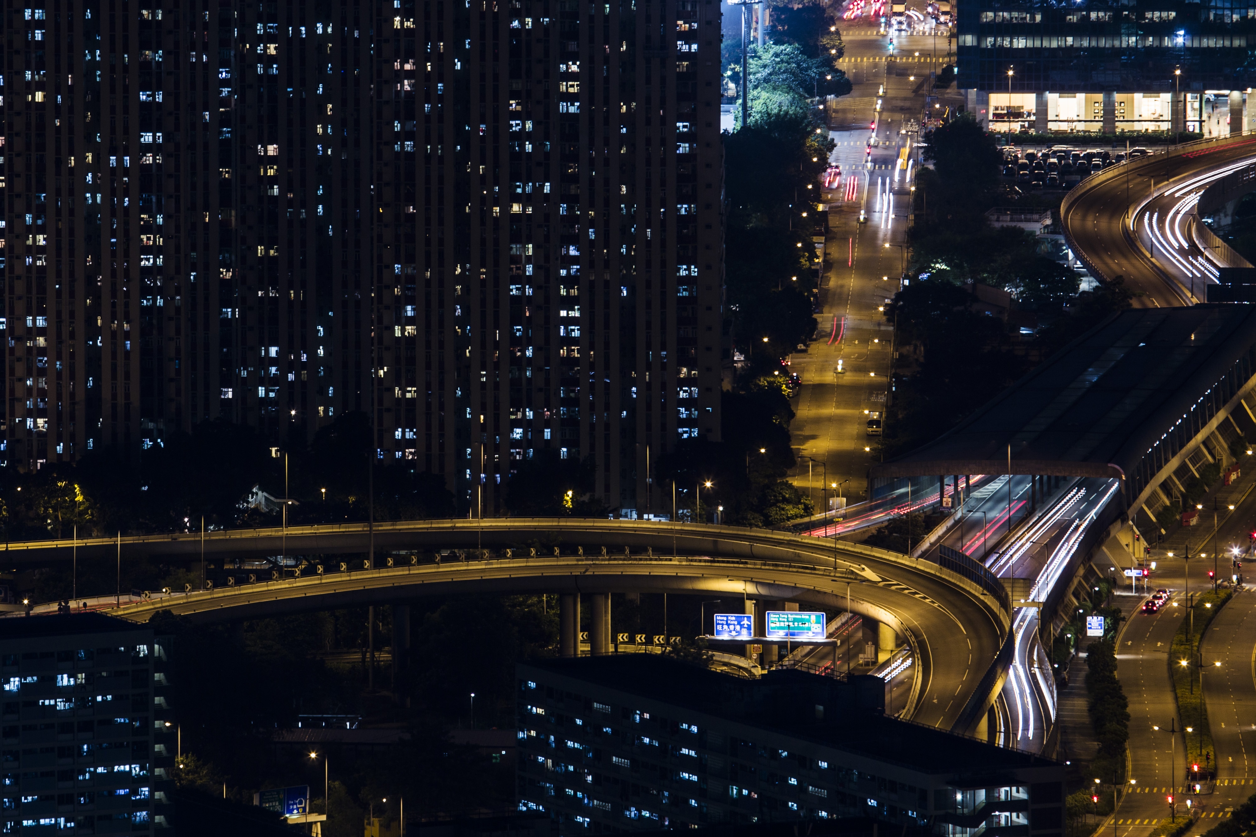 Light trails from traffic are formed on the Kwun Tong Bypass near residential buildings standing illuminated in this long exposure photograph taken at night in the Kowloon Bay district of Hong Kong, China. (Photographer: Justin Chin/Bloomberg)
