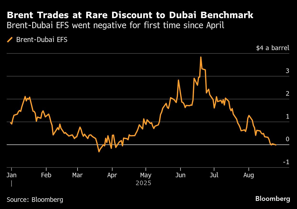 Brent futures were trading at a discount of 3 cents a barrel to Dubai, the first time the differential has turned negative since April, according to data compiled by Bloomberg. Most crudes produced in the Persian Gulf — the main source of Asia's supply — are priced relative to Dubai.