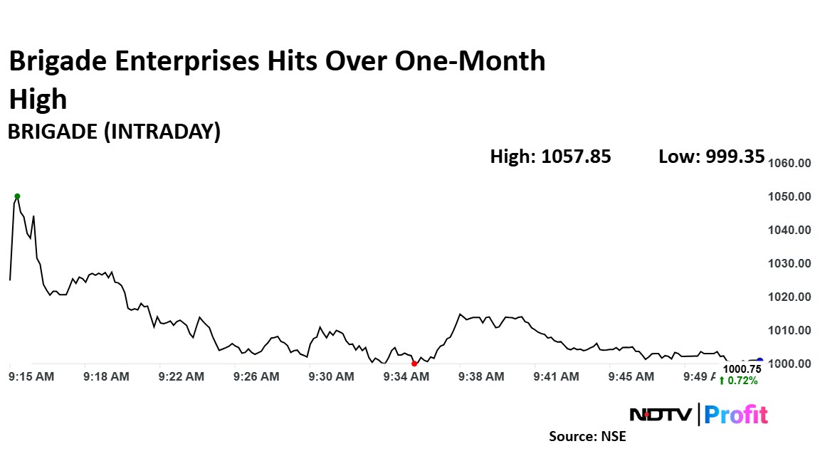 Shares of Brigade Enterprises rose as much as 6.47% to Rs 1,057.85 apiece, the highest level since Feb. 13. It pared gains to trade 1.07% higher at Rs 1,004.25 apiece, as of 9:48 a.m. This compares to a 0.60% advance in the NSE Nifty 50.