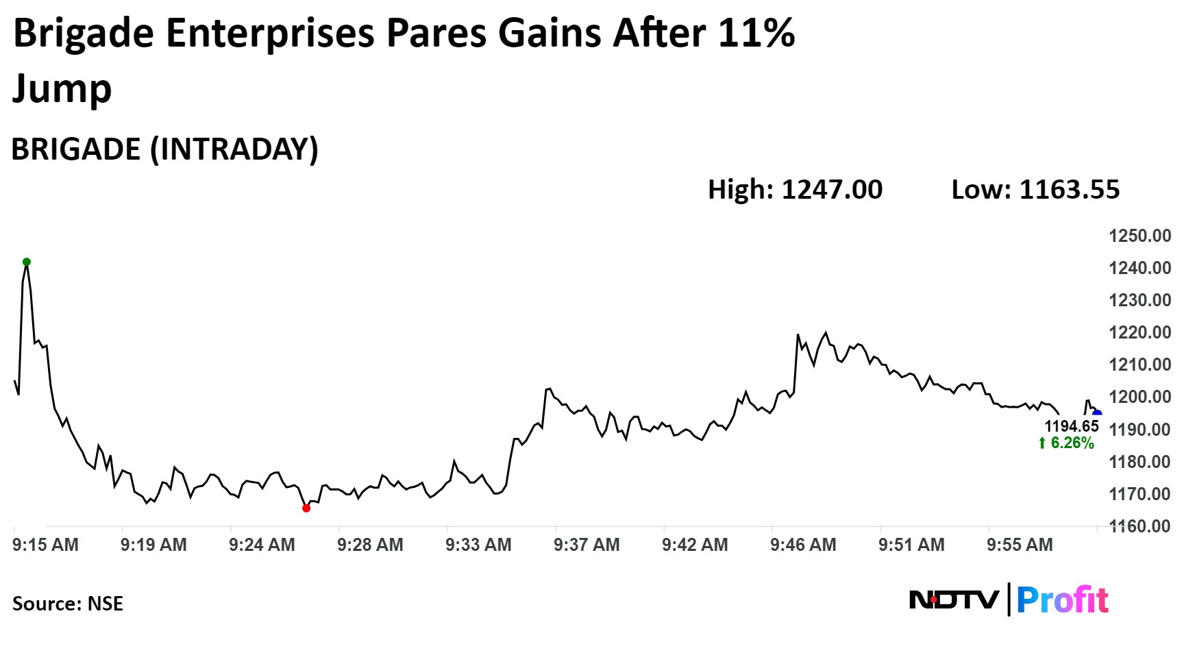 Shares of Brigade Enterprises surged nearly 11%, the most in two months, after its profit jumped nearly four-fold in the first quarter.