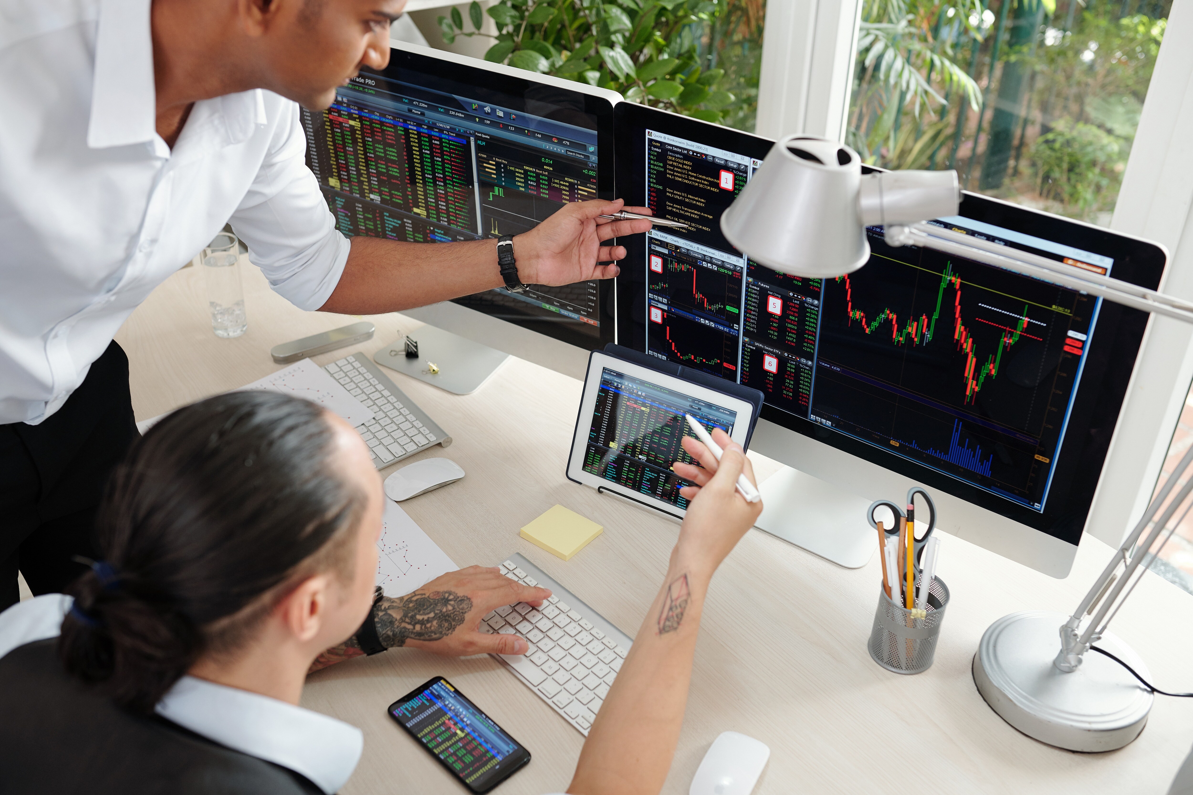 Team of serious stockbrokers having conversation in office with multiple display screens and analyzing stock trends. (Envato)