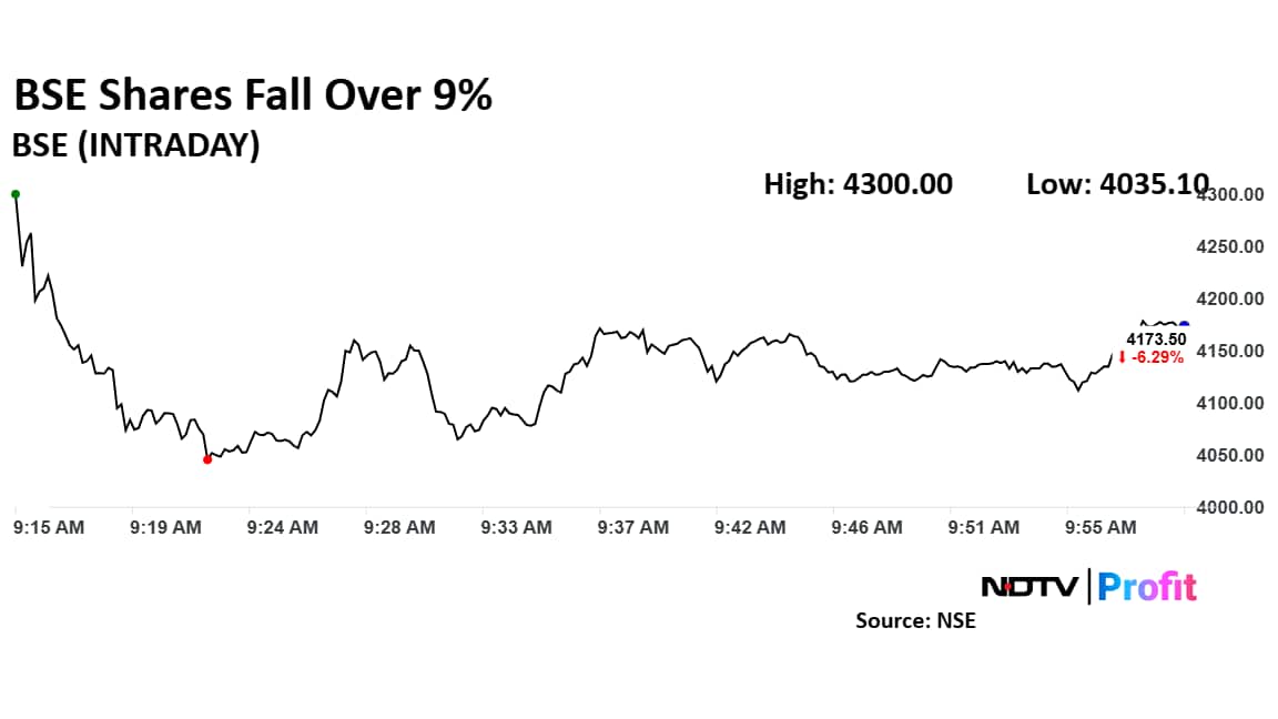 BSE shares fell as much as 9.40% to Rs 4,035.10 apiece, the lowest level since Oct. 23, 2024. It pared losses to trade 5.16% lower at Rs 4,231 apiece, as of 10:12 a.m. This compares to a 0.71% advance in the NSE Nifty 50.