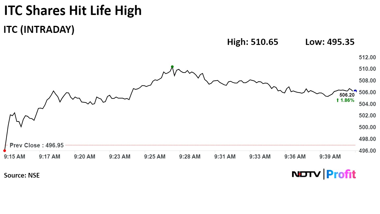 ITC's stock rose as much as 3.75% in early trade to Rs 510.6 apiece on the NSE. It was trading 3.13% higher at Rs 507.6 per share, compared to a 0.06% advance in the benchmark Nifty at 09:36 a.m.