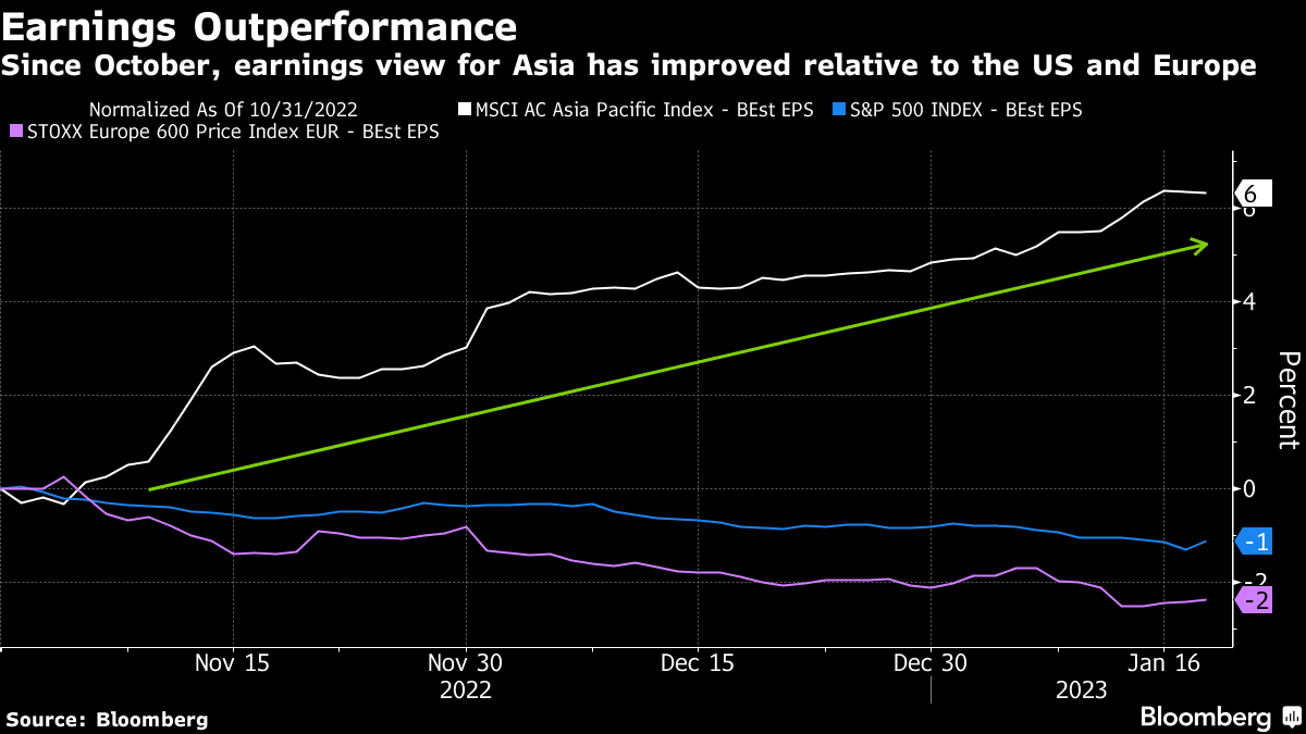 Meanwhile, earnings paint a promising picture. Twelve-month forward profit estimates for the MSCI Asia benchmark have risen about 6% since the end of October, compared with a drop of at least 1% each for gauges representing the US and Europe, according to Bloomberg data.