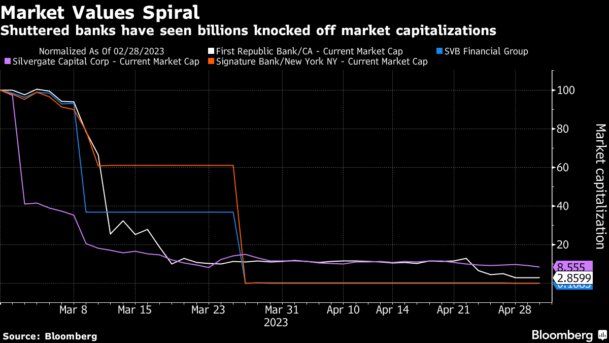 (Bloomberg) -- The collapses that claimed four US lenders this year have stuck investors with more than $54 billion of losses, after First Republic Bank's demise added to the pile of nearly worthless securities and sent some peers into a new tailspin.