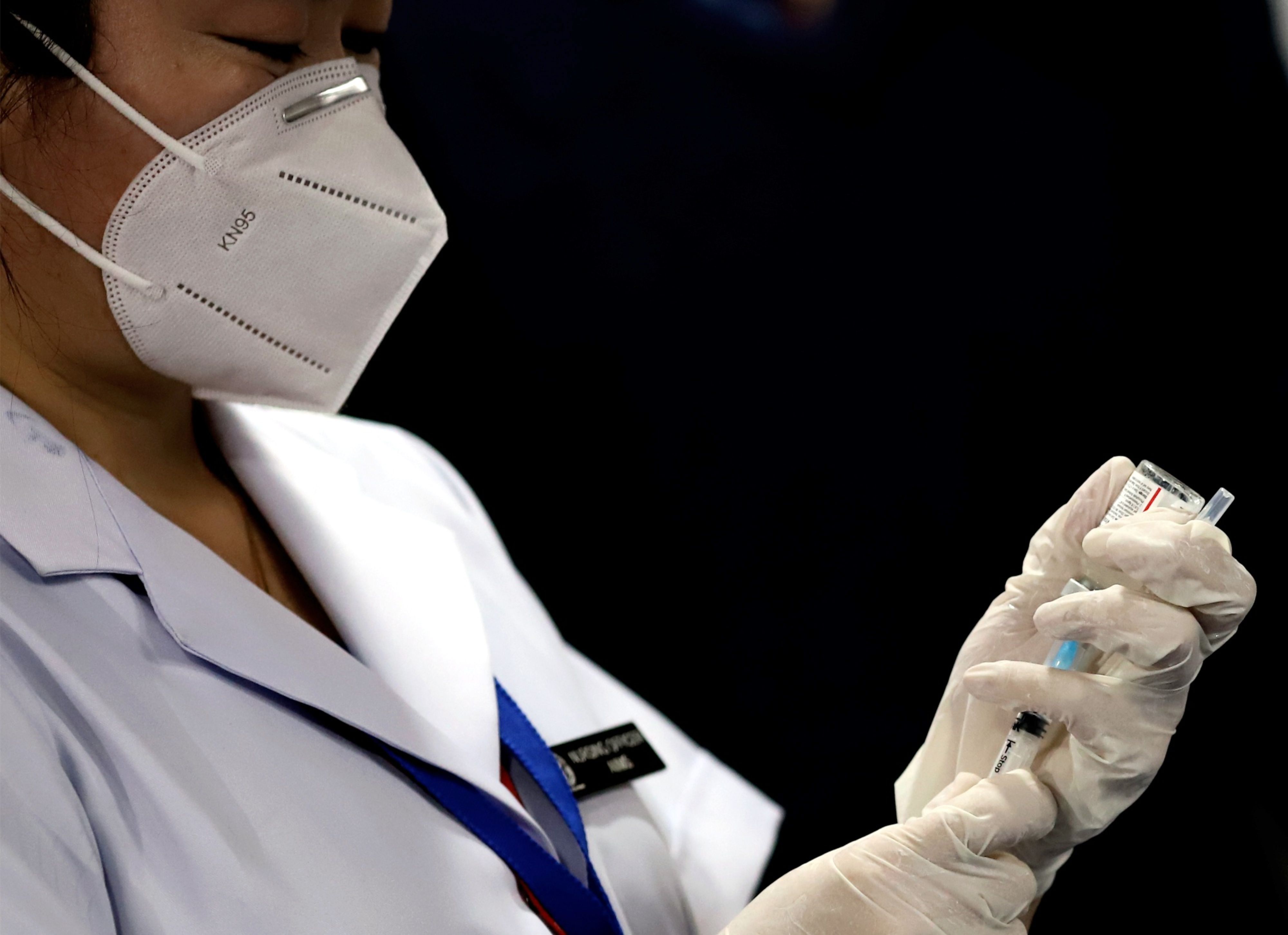 A health worker wearing a protective mask prepares a syringe of Covid-19 vaccine in New Delhi. (Photographer: Anindito Mukherjee/Bloomberg)