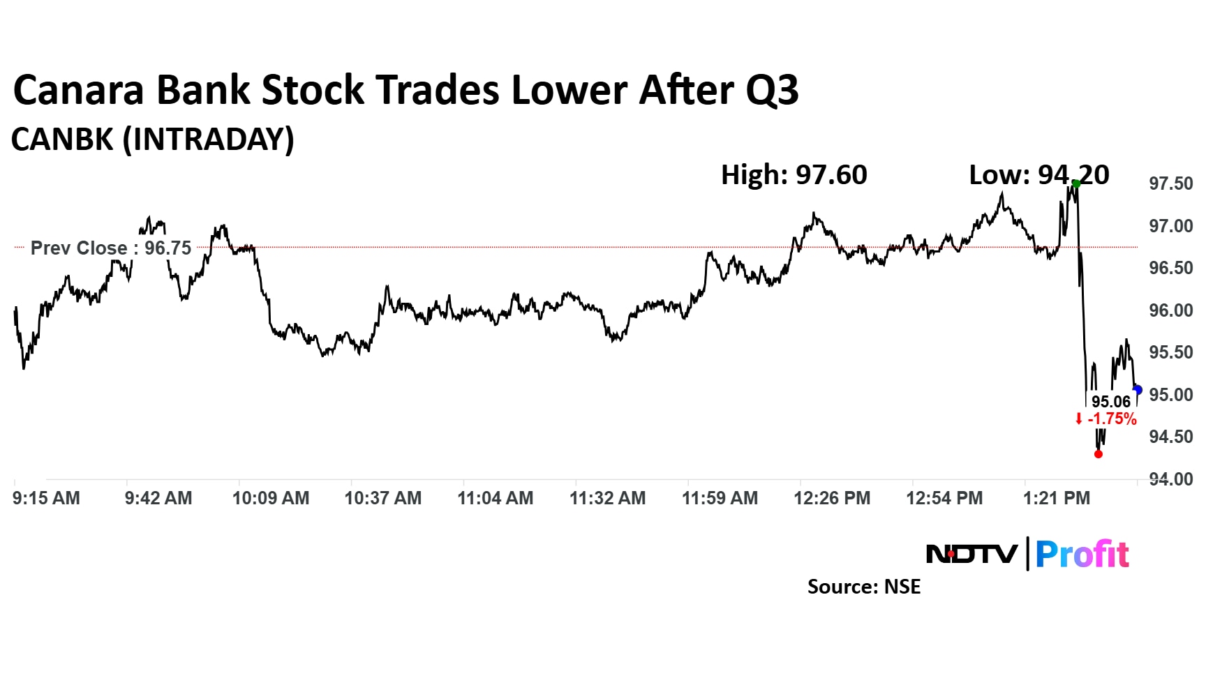 Canara Bank's shares fell as much as 2.6% intraday to Rs 94.2 apiece after the results were annnounced. The scrip was trading 1.75% lower by 1:50 p.m. The benchmark NSE Nifty 50 was down 1%.