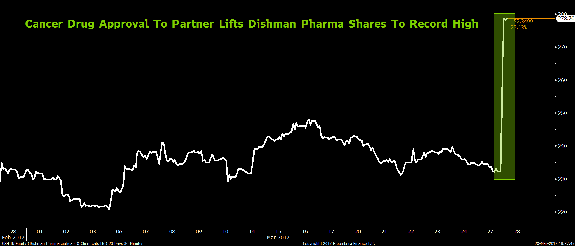 Shares of Dishman Pharmaceuticals & Chemicals Ltd. rose to a record after its American partner Tesaro, Inc. received U.S. drug regulator's nod for ovarian cancer drug Zejula.