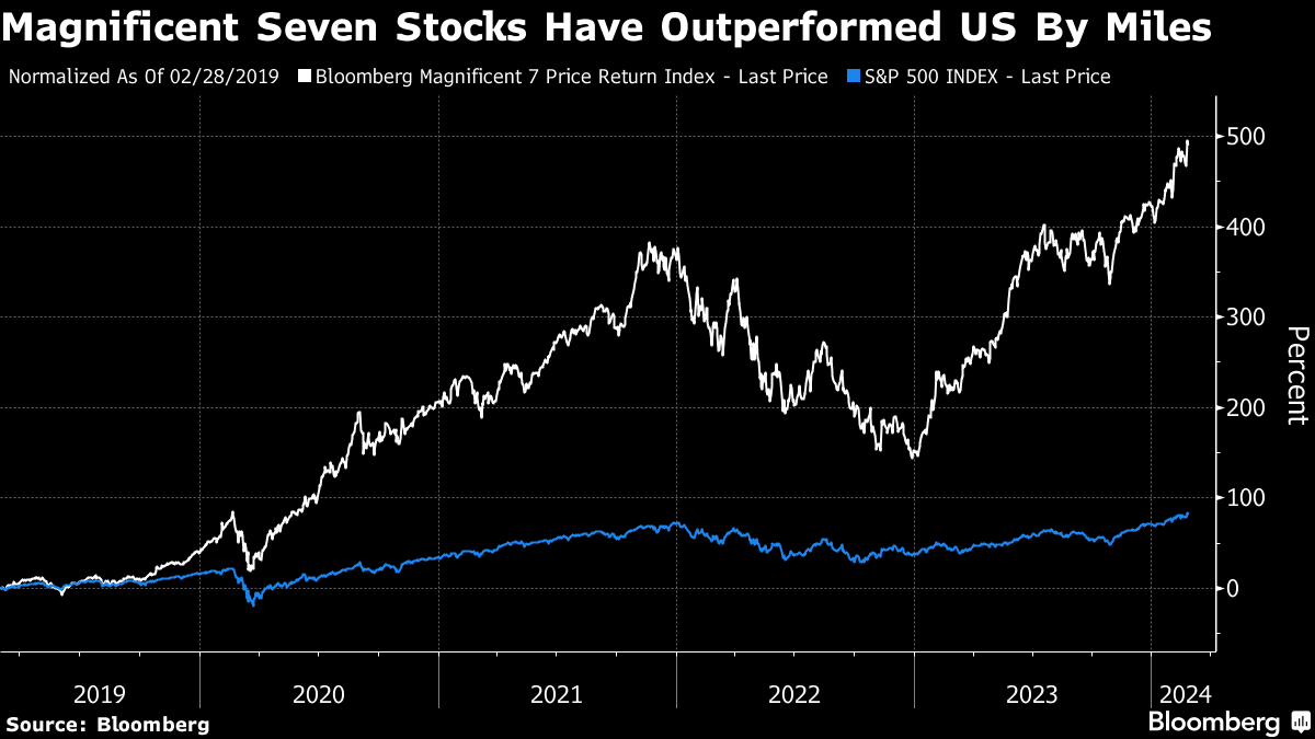 The rejigging underscores how investors are increasingly questioning whether the cohort — comprised of Apple Inc., Microsoft Corp., Nvidia, Alphabet Inc., Amazon.com Inc., Meta Platforms Inc. and Tesla Inc. — can repeat last year's performance, when an index of the seven stocks more than doubled versus the S&P 500's 24% gain.
