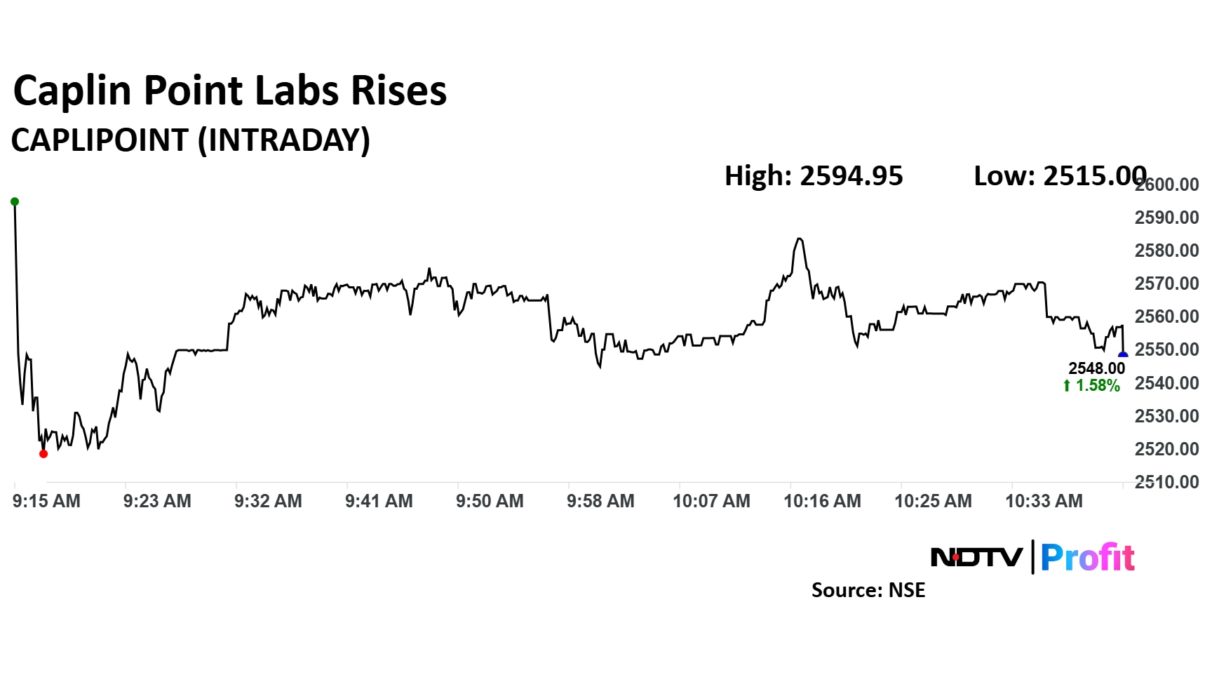 Caplin Point Laboratories Ltd.'s share price rose 3.46% to Rs 2,594.95 apiece, the highest level since Jan 3. It was trading 2.03% higher at Rs 2,559.20 as of 10:38 a.m., as compared to 0.58% advance in the NSE Nifty 50 index.