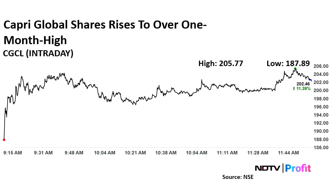 Capri Global Capital share price rose as much as 12.79% to Rs 205 apiece, the highest level since Dec. 13. The stock pared gains to trade 12.24% higher at Rs 204.01 apiece, as of 11:56 a.m. This compares to a 0.60% advance in the NSE Nifty 50 Index.