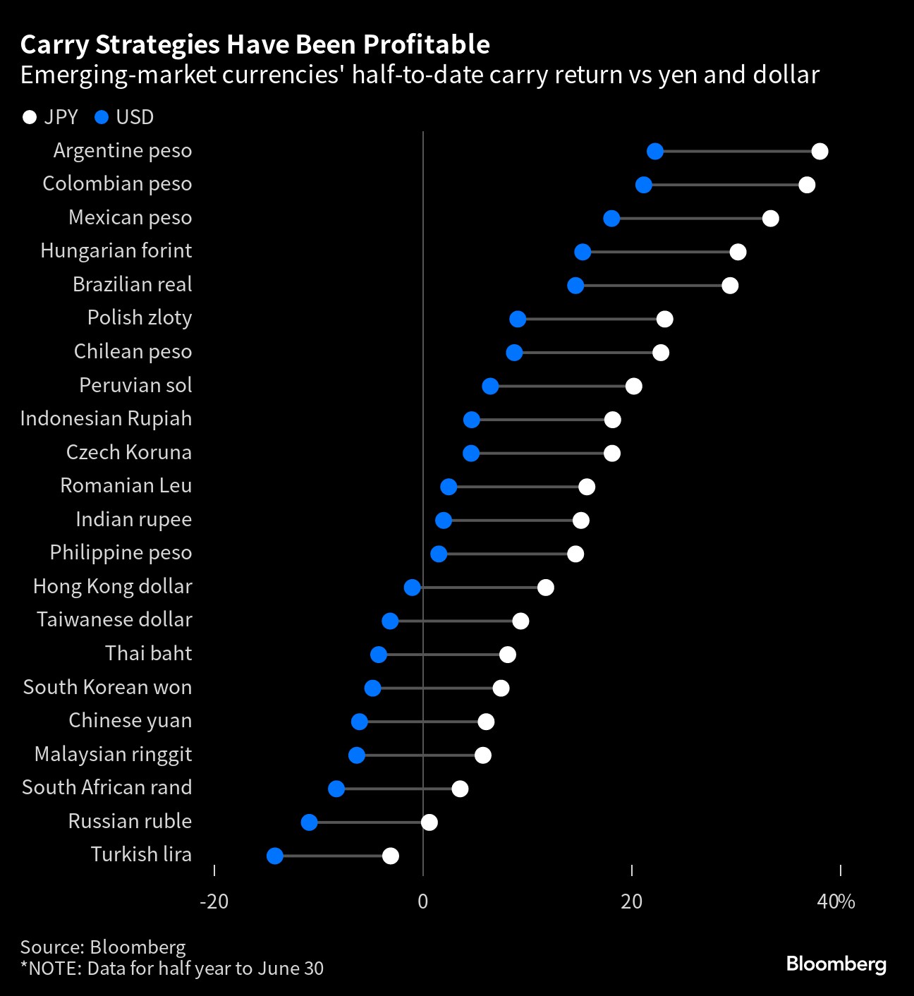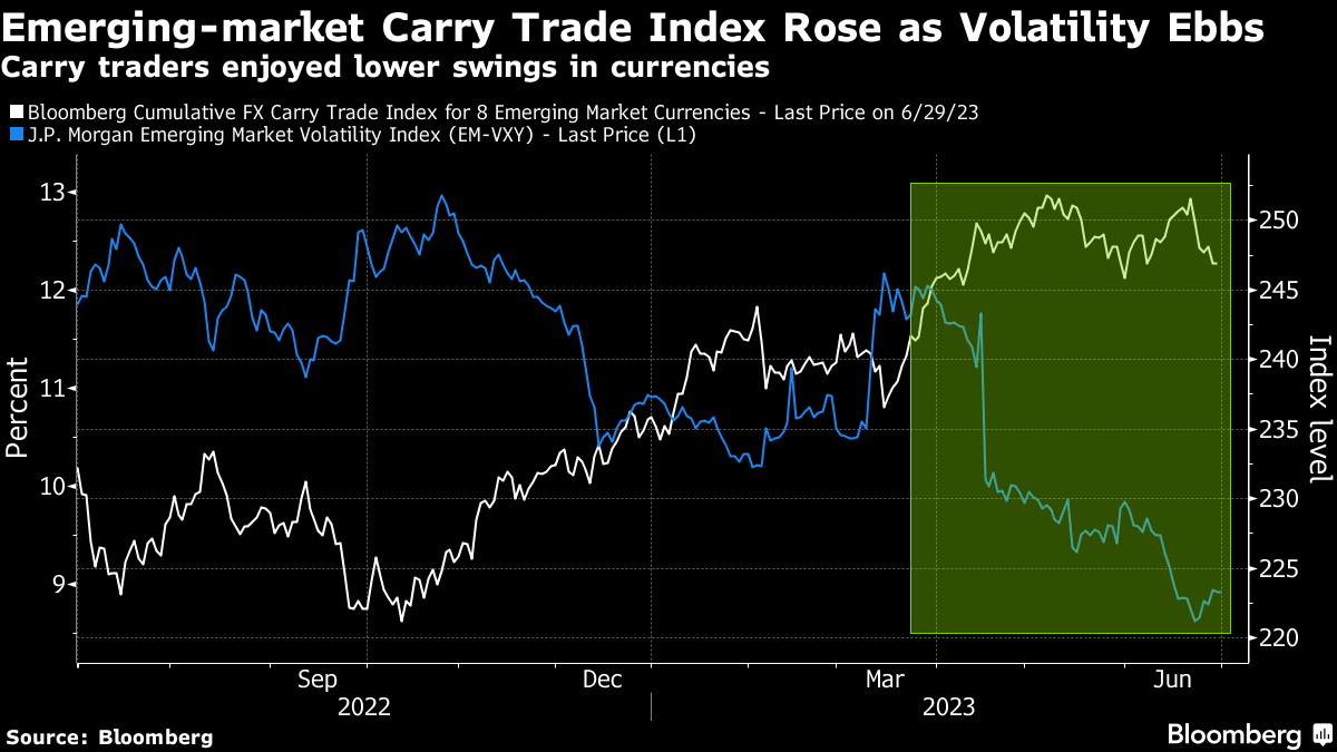 A Bloomberg index that measures carry-trade returns from eight emerging markets, funded by short positions in the dollar, climbed 4.7% in the first half, and is now on track for the best yearly gain since 2017. Mexico's peso has notched up carry-trade gains of 18%, while Hungary's forint returned 15.4% and Brazil's real 14%. The carry trade is a strategy that involves borrowing in countries with low interest rates to invest in higher-yielding assets and currencies.