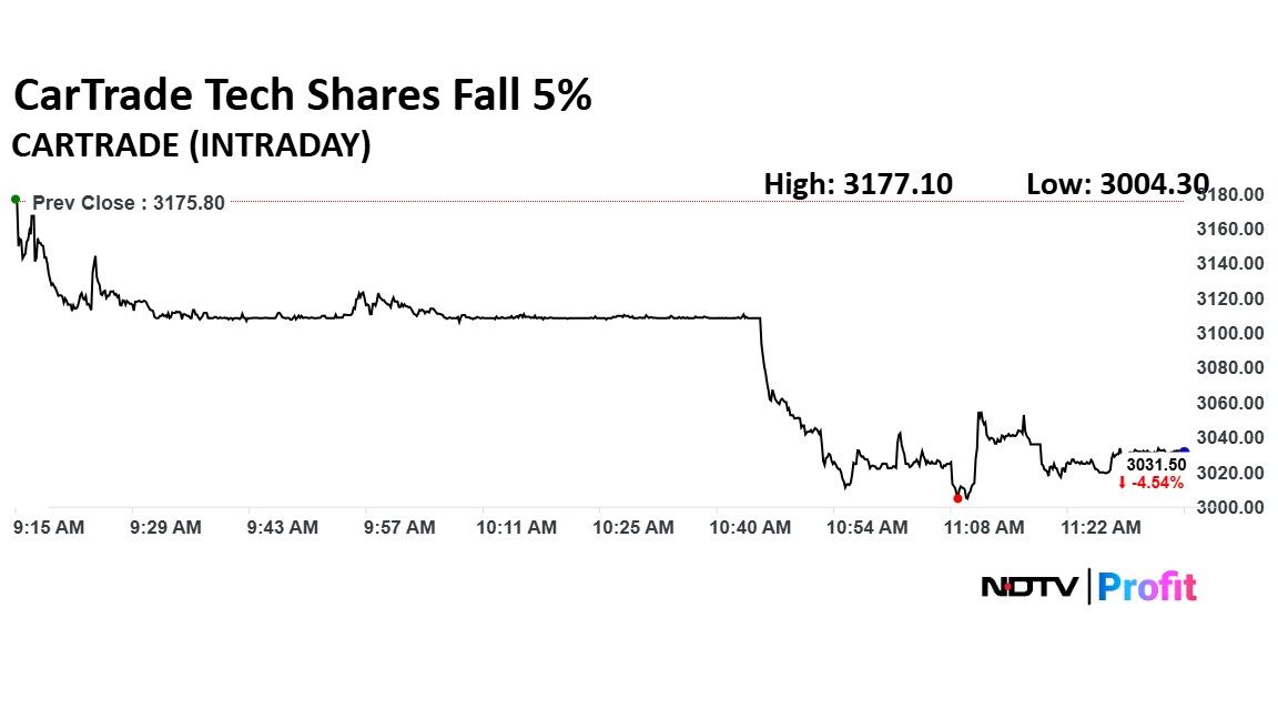 - Shares of CarTrade fell over 5% following the announcement of the deal cancellation