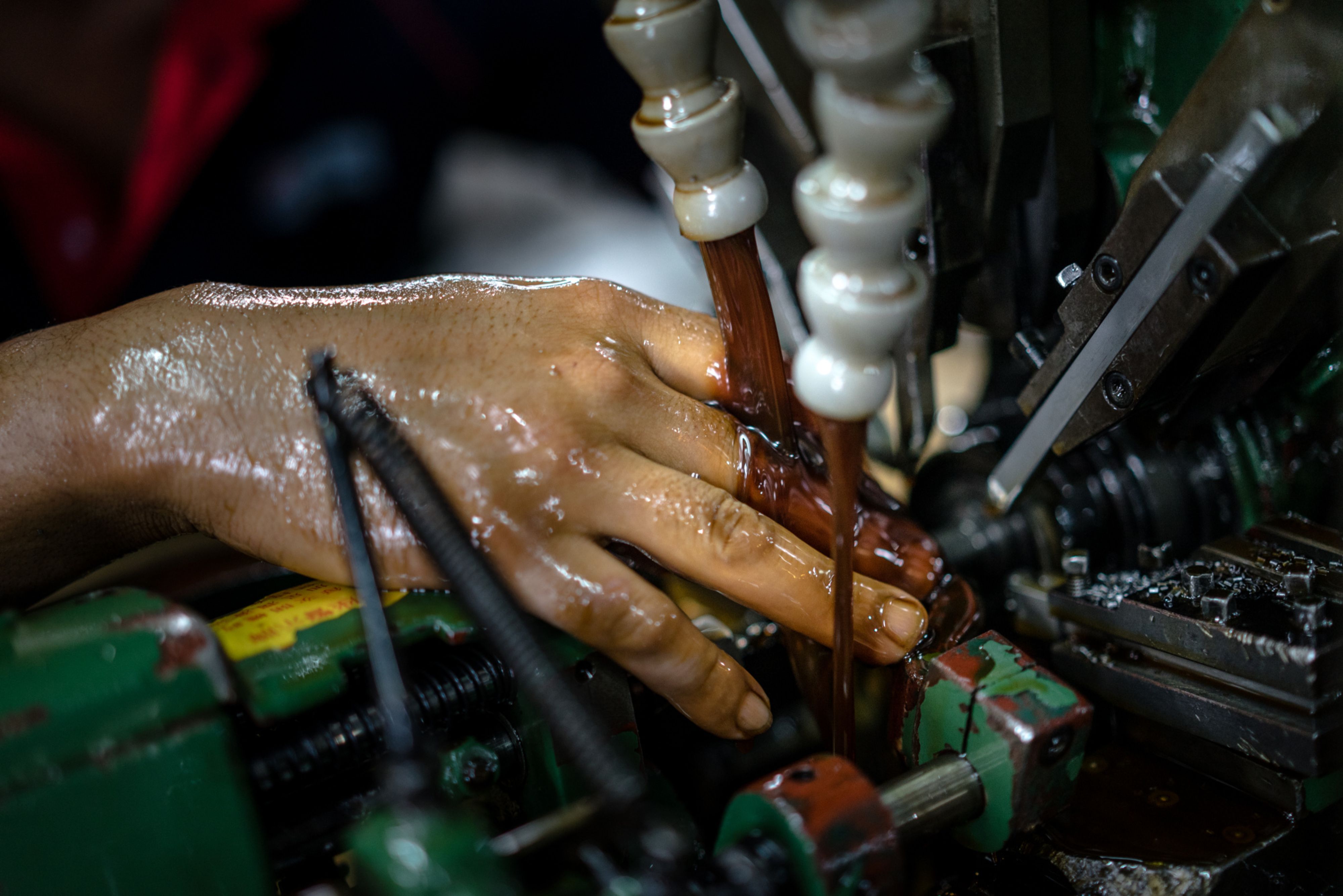 Oil pours over the hand of an employee working with a lathe on the production line at a manufacturing facility. (Photographer: Sanjit Das/Bloomberg )