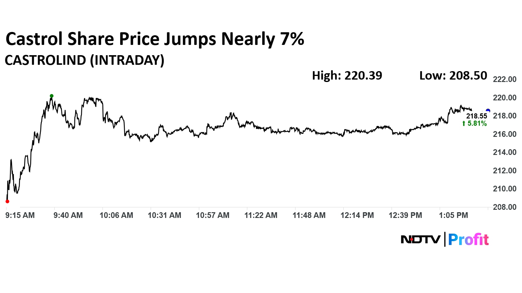 Castrol India Ltd.'s share price rose nearly 7% after Bloomberg reported that big corporates like Reliance Industries and buyout firms like Apollo and Lone Star expressed interest in acquiring ownership of the company.