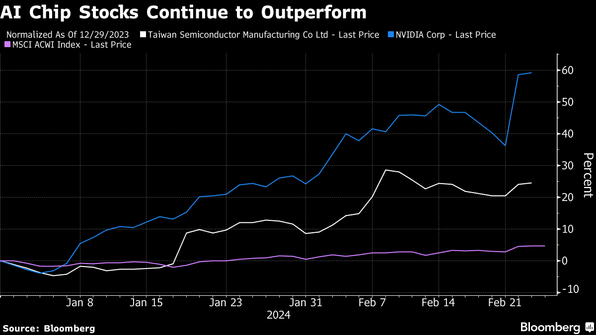 Wood is trimming her holdings in the global chip bellwethers as the artificial intelligence frenzy intensifies, with Nvidia's stellar earnings powering global markets to new heights. Nvidia is up 59% year-to-date and TSMC's ADRs have soared 25%.