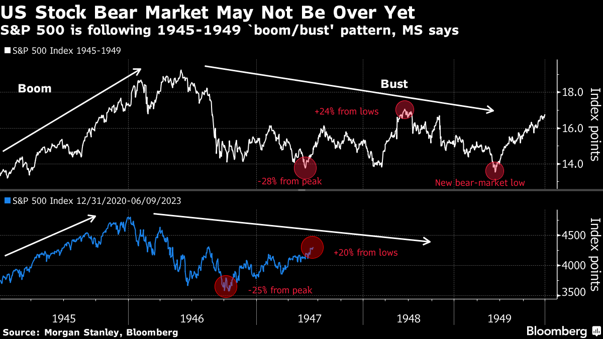 Goldman Sachs strategists expect the gains to continue as other sectors catch up with the searing rally for technology shares. Morgan Stanley's Michael Wilson, meanwhile, points instead to the example of the bear market of the 1940s, when the S&P 500 rallied 24% before returning to a new low.