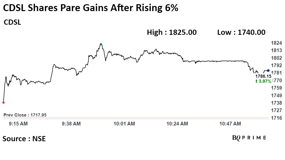 CDSL's stock rose as much as 6.17% during the day to Rs 1,825 apiece on the NSE. It was trading 4.71% higher at Rs 1,800 apiece compared to a 0.04% decline in the benchmark Nifty 50 as of 10:56 a.m.