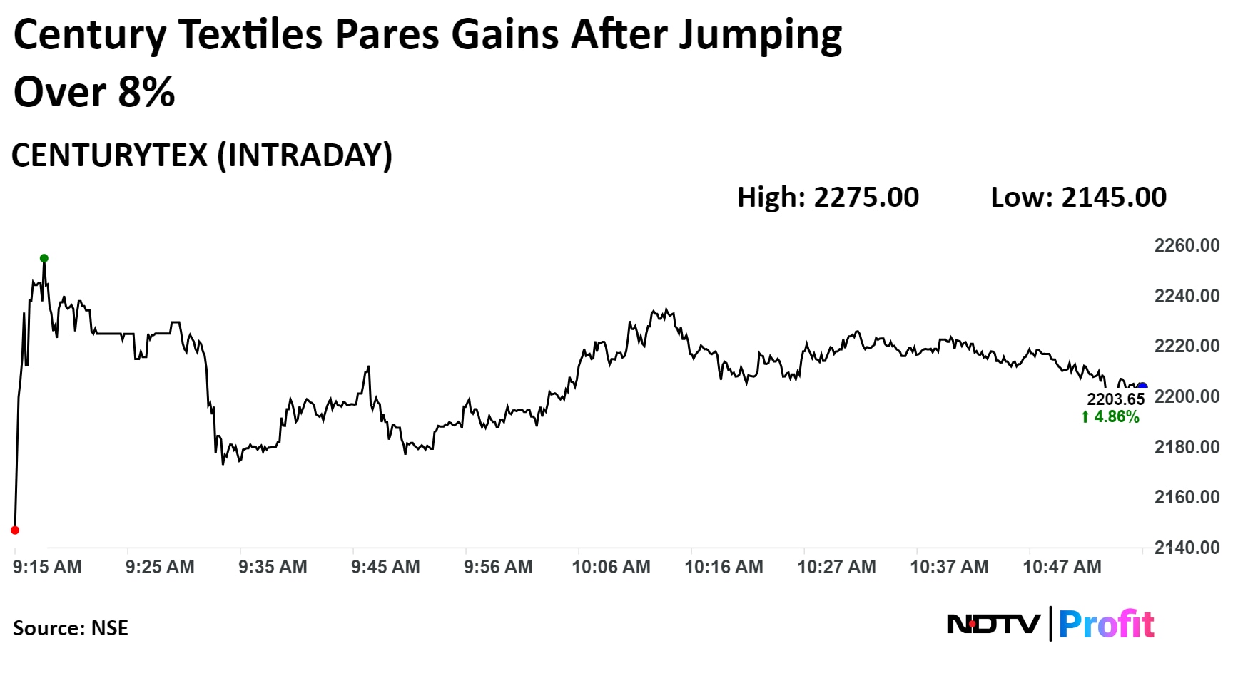 Shares of Century Textiles and Industries Ltd. jumped over 8% on Tuesday as the company's wholly owned subsidiary, Birla Estates Pvt., acquired a five-acre land parcel in sector 71, Gurugram.