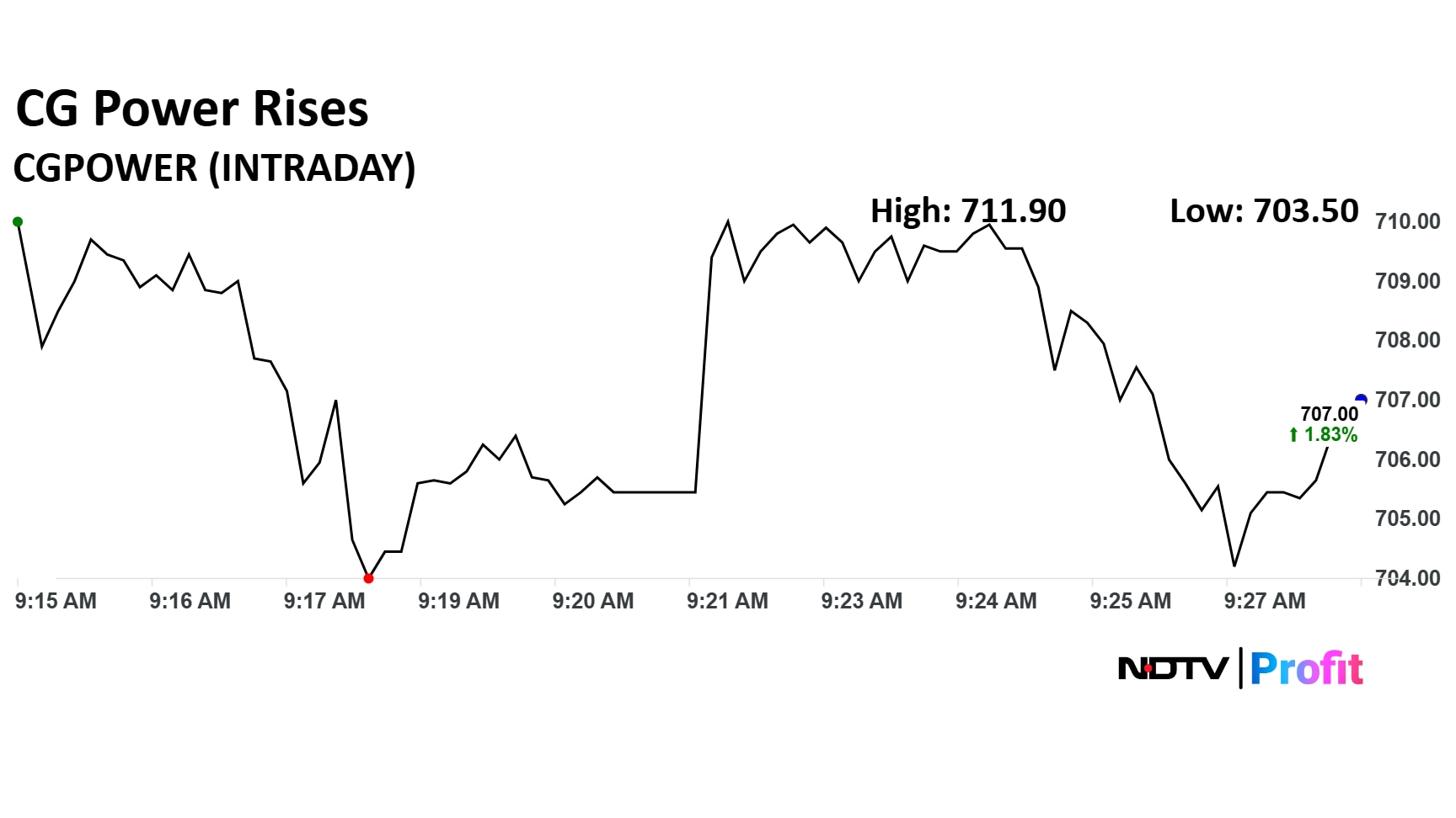 CG Power And Industrial Solutions share price rose as much as 3.69% to Rs 711.90 apiece, the highest level since Jan 8. It was trading 2.97% higher at Rs 714.95 apiece as of 9:44 a.m., compared to 0.44% advance in the NSE Nifty 50 index.
