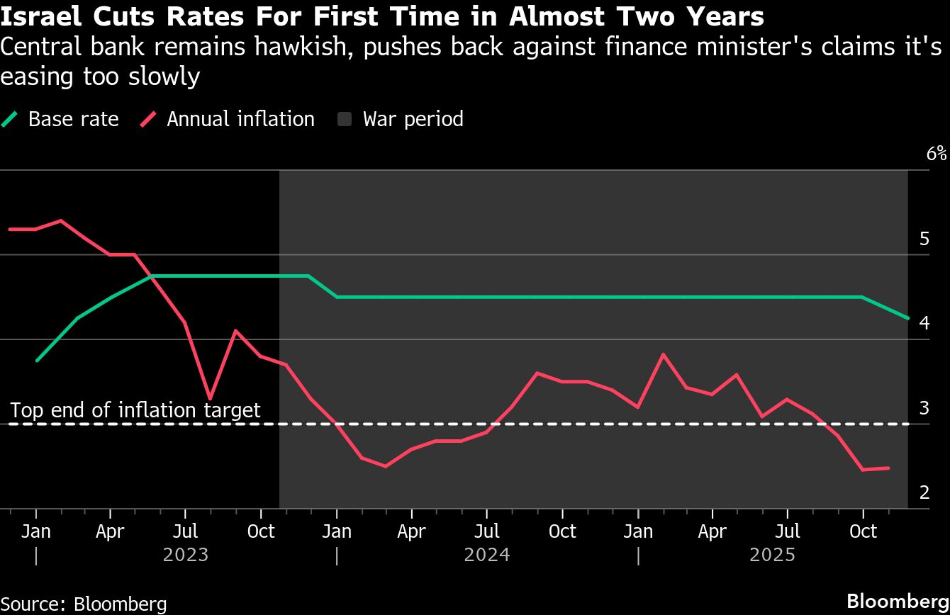 Israel lowered interest rates following a ceasefire in Gaza, though the central bank signaled a cautious approach toward future cuts in face of criticism from the finance minister that it's not easing fast enough.