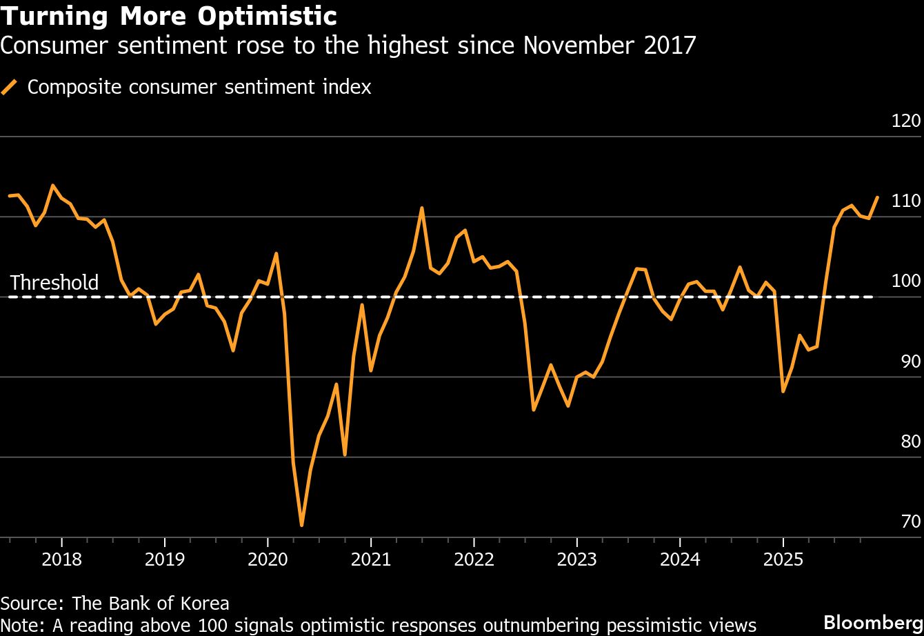 South Korea's consumer confidence climbed to an eight-year high in November, supported by a trade agreement with the US that eased uncertainty over export prospects and by stronger-than-expected growth over the summer.