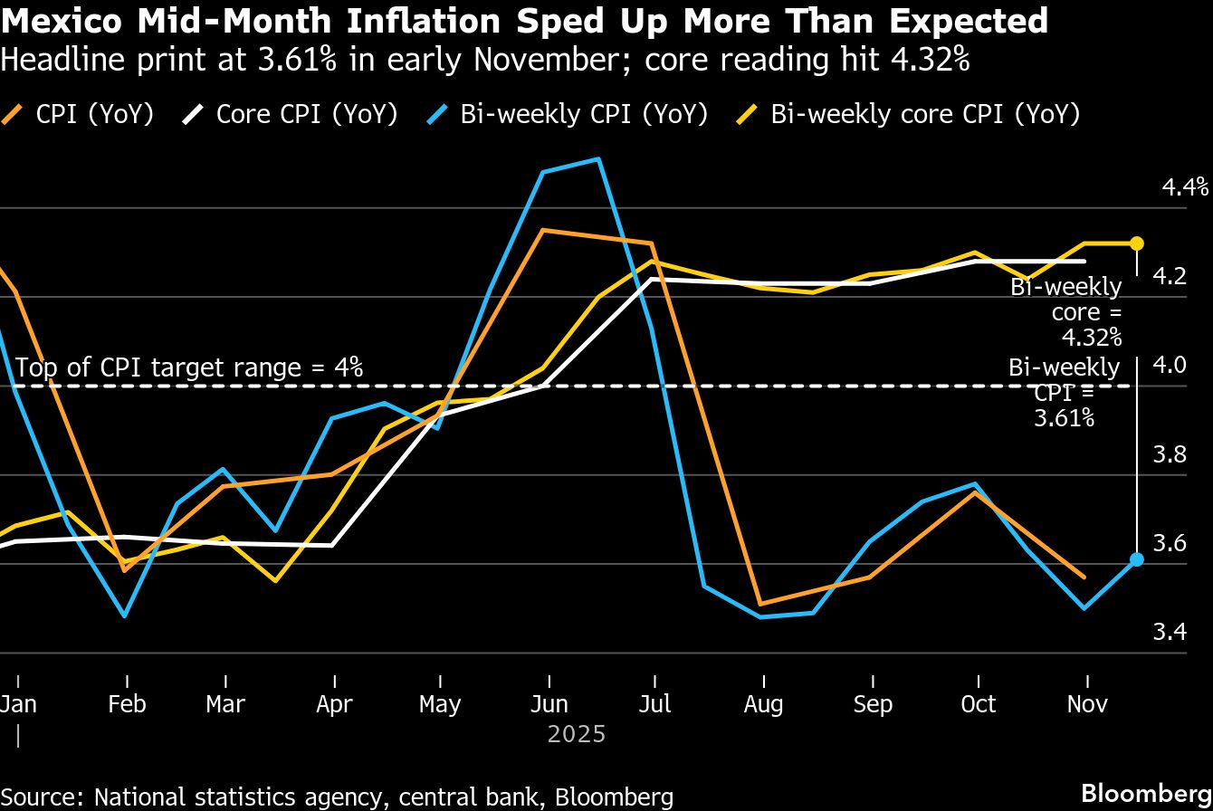 Mexico's annual inflation accelerated more than expected in early November after the central bank reiterated concerns of persistent price increases. Consumer prices rose 3.61% in the first two weeks of November compared to the same period last year.