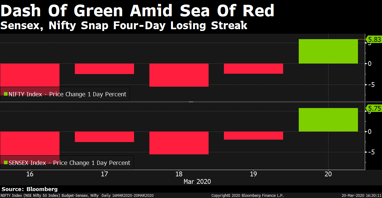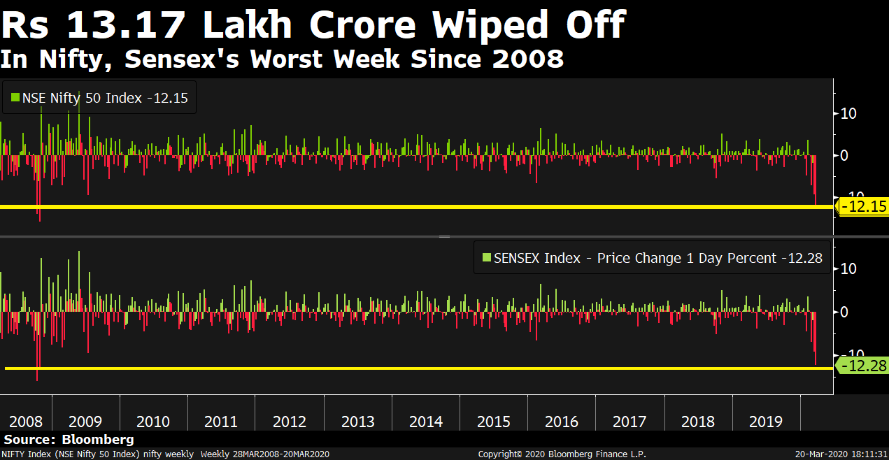 The S&P BSE Sensex and the NSE Nifty 50 were down 12 percent each this week. The losses were partially cushioned by the 6 percent gain on Friday. This was the best one-day jump for both the indices since 2009. The indices still posted their worst week since 2008.