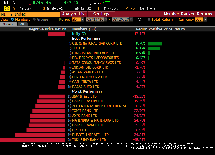 46 out of the 50 stocks in the Nifty index ended the week with losses. Four defied the rout to post gains. Oil and Natural Gas Corporation Ltd. was the top performer on the index, followed by FMCG bellwethers Hindustan Unilever Ltd. and ITC Ltd., along with Dr Reddy's Laboratories Ltd., completed the list of gainers.