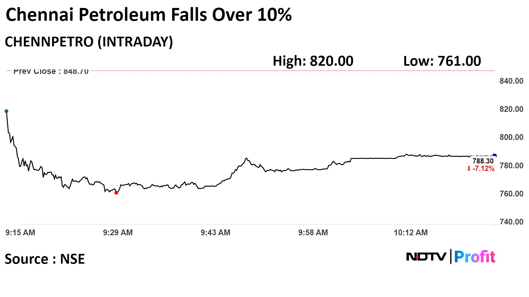 On the NSE, Shares of the company fell as much as 10.33% during the day to Rs 761 apiece, the lowest since Nov. 1. It was trading 7.15% lower at Rs 788 per share, compared to a 0.20% advance in the benchmark Nifty 50 at 10:33 a.m.